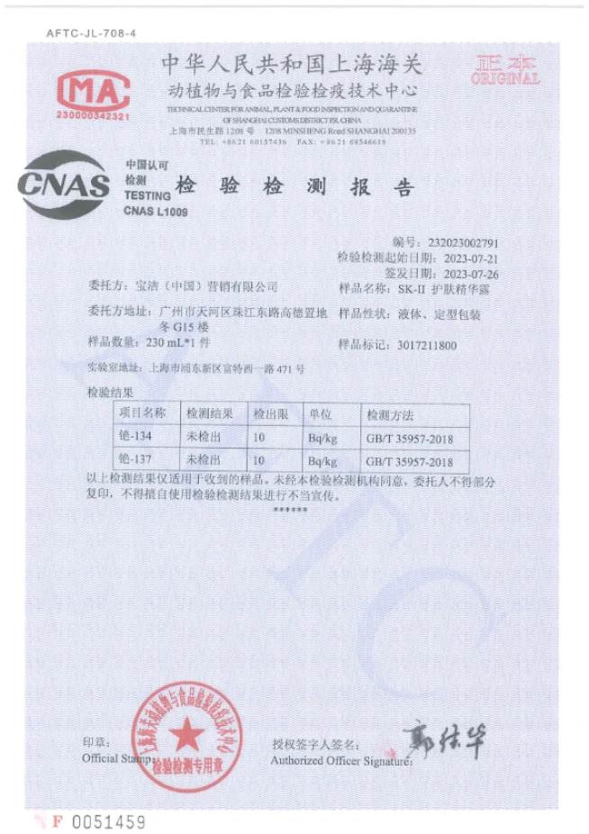SK-II已将检测常态化,我们在具有检验检测机构资质(CMA)及中国合格评定国家认可委员会(CNAS)认可的第三方检测机构按照国家检测标准主动对SK-II产品进行相关检测,消费者可放